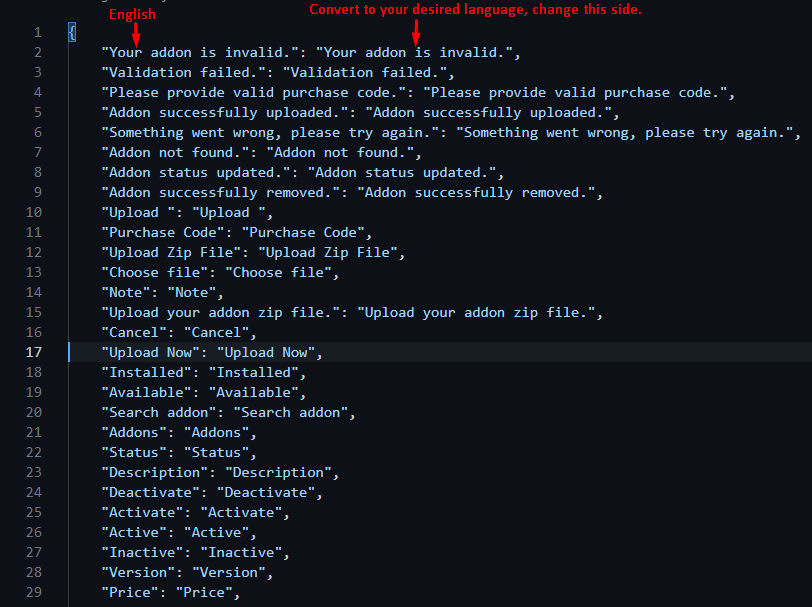 8) In the JSON file, the left side contains English language phrases, and the right side will be filled with your translated language.