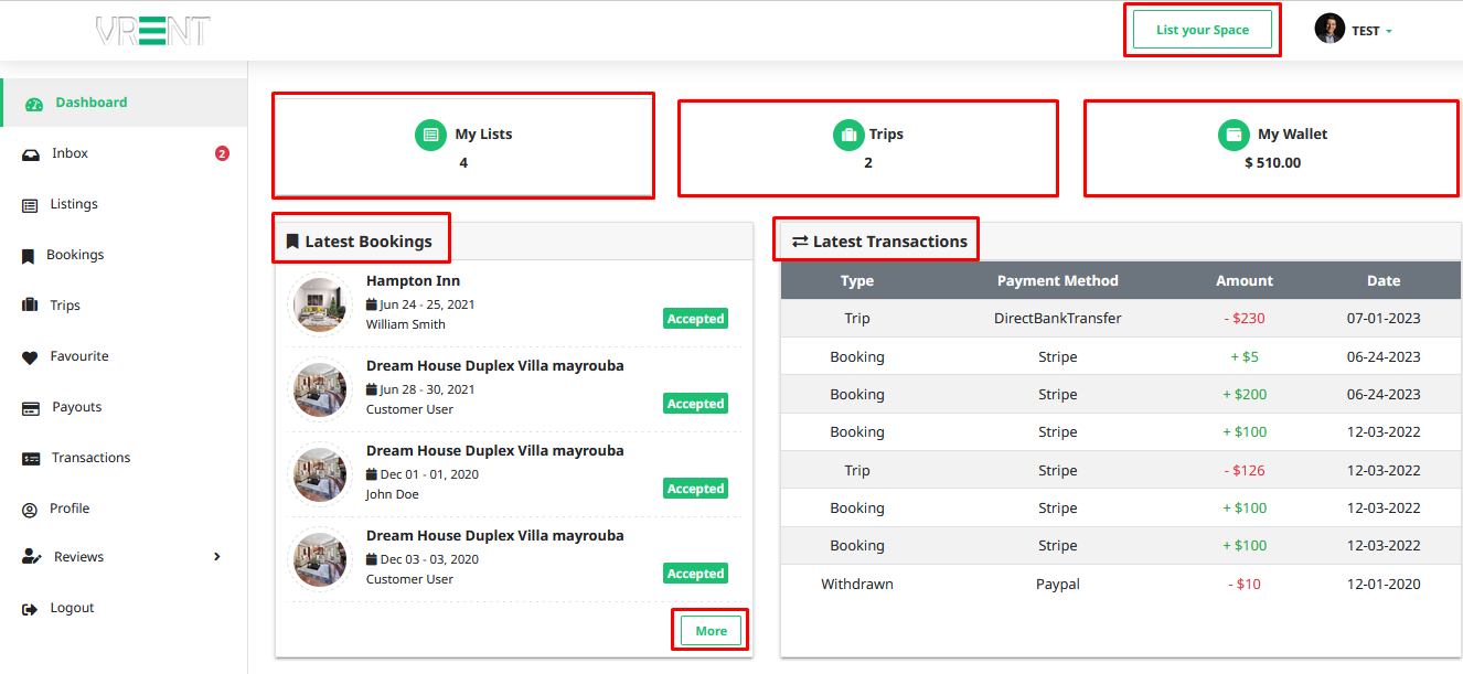 From the dashboard, users can navigate to their trip list and property list. Additionally, they can access their booking list directly from this section.