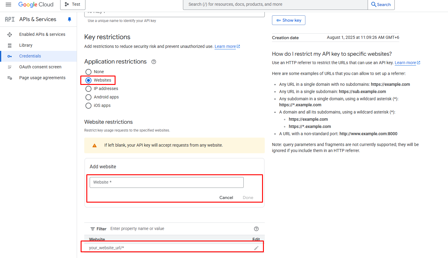 - Under Key Restrictions → Application Restrictions, select HTTP referrers (websites)