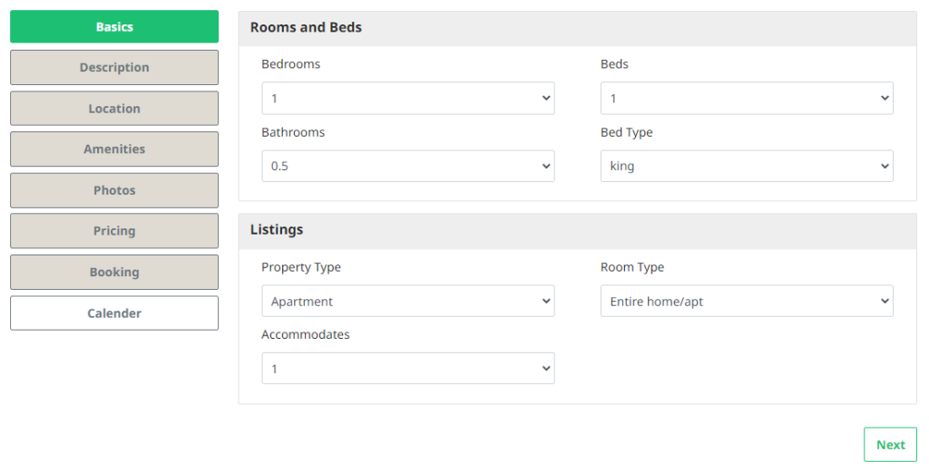 The listing details will be displayed on the Basic option page, where hosts can make changes if needed. Clicking on the Next button will save the changes and proceed to the next page.