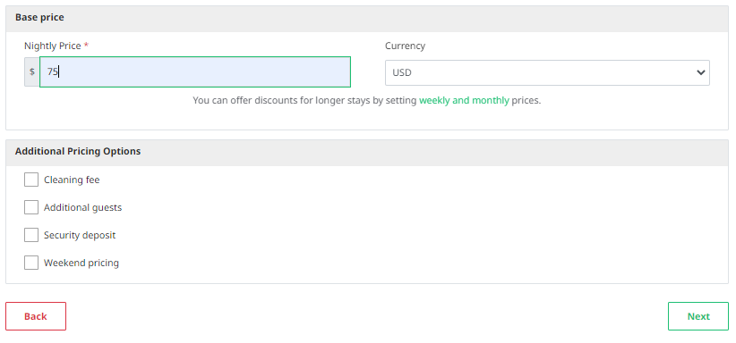 Hosts can establish a base price per night for their listing. Additionally, they have the flexibility to select the desired currency from a currency list. Furthermore, hosts can offer discounts for longer stays by setting weekly and monthly prices.
