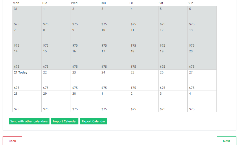 Your nightly rate will be displayed for each available night on the calendar. However, any weekly, monthly pricing, or additional pricing will not be shown on the calendar.