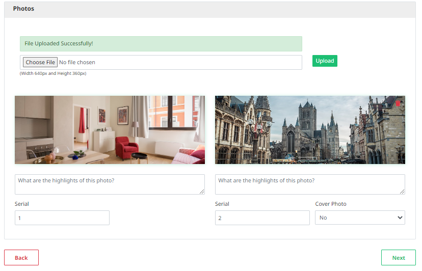 Hosts have the option to upload multiple photos for their listing property simultaneously. They can then designate any of these images as the cover photo, which will be displayed as the first image on the listing page. Additionally, hosts can delete any uploaded photos if needed.