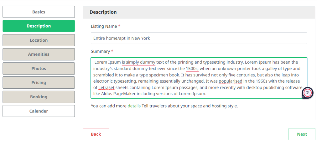 Host can add listing name within 50 characters & add listing description in summary field with 500 characters.