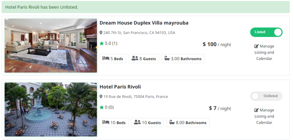 Once hosts complete the listing steps, they can view their listing. Hosts also have the option to change their listing status to Listed or Unlisted. If the property is unlisted, it will not be visible to guests. Please refer to the screenshot for details.