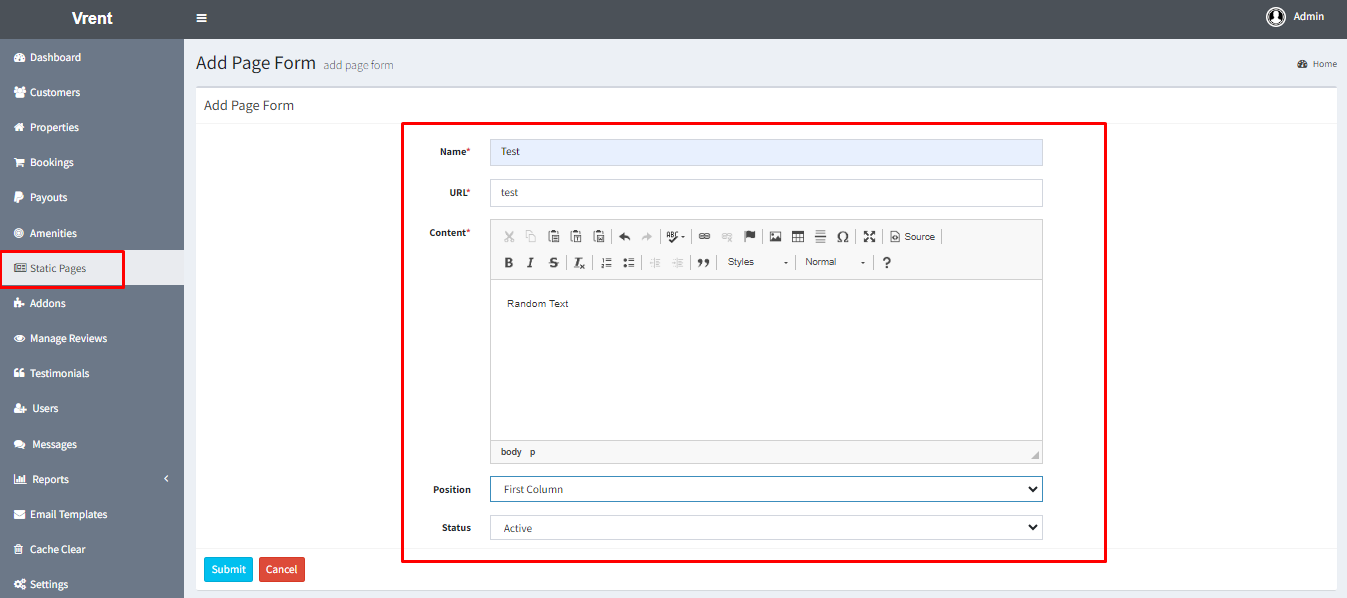 To setup static pages Navigate to the Admin Panel > Static Pages > Add pages Fillup the necessary information and click save.