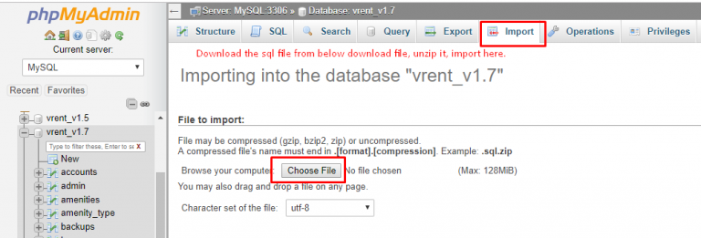 Lastly, import your database. Log in to phpMyAdmin from your browser, select the database name, click on "Import", and upload the SQL file.