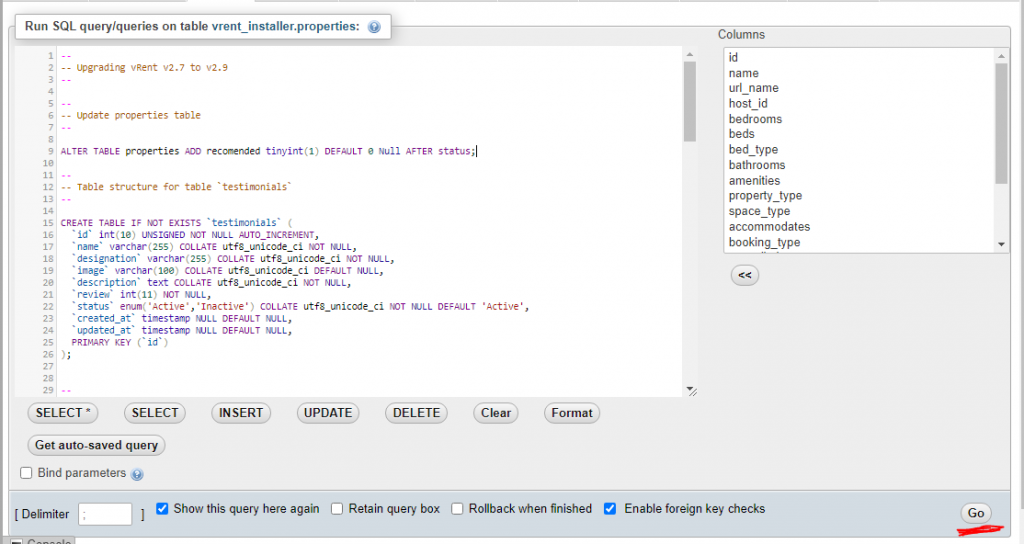 5) Click on the 'Go' button to execute the SQL queries and continue with the database update process.