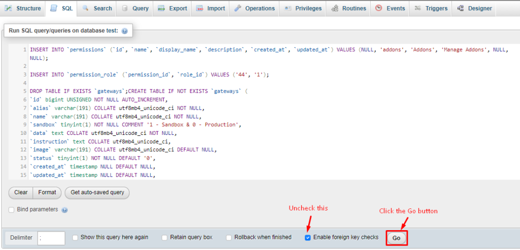 5) Click on the 'Go' button to execute the SQL queries and continue with the database update process.