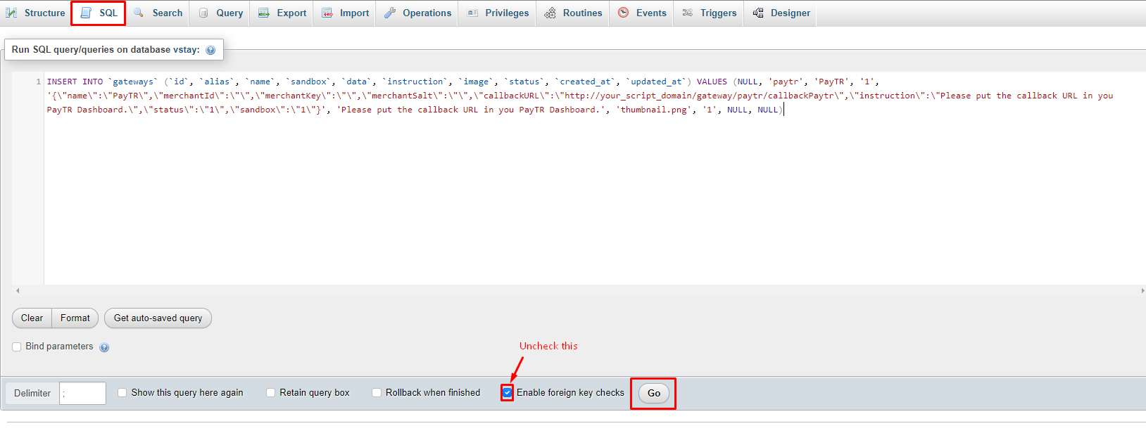 4) In PHPMyAdmin, navigate to the SQL tab, paste the copied SQL file text into the input area, and ensure that the