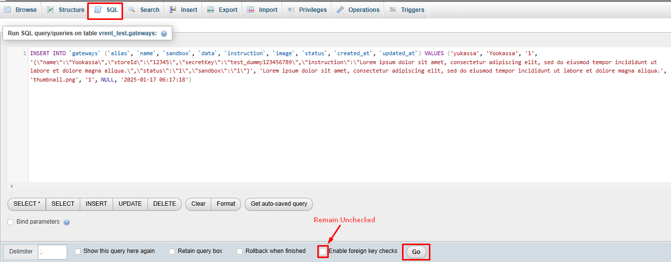 4) In PHPMyAdmin, navigate to the SQL tab, paste the copied SQL file text into the input area, and ensure that the